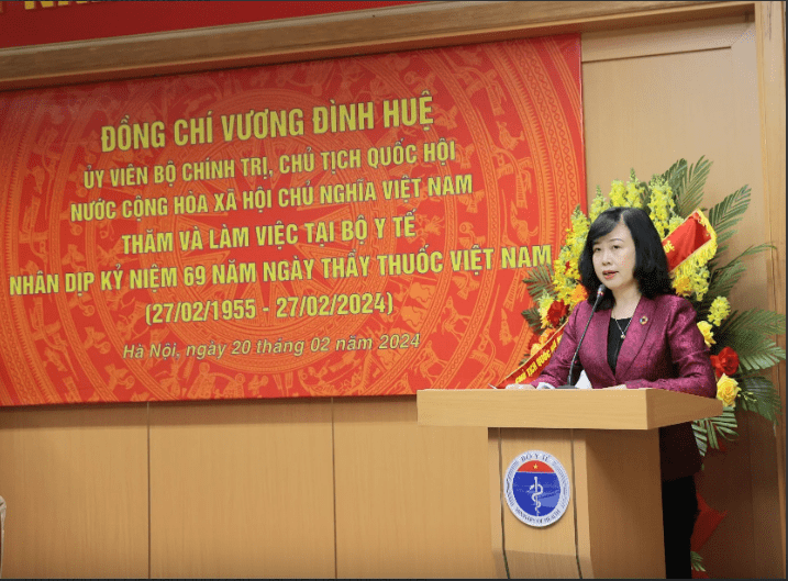 Báo cáo với Chủ tịch Quốc hội và Đoàn công tác, thay mặt Bộ Y tế, Bộ trưởng Đào Hồng Lan cho biết, năm 2023, ngành Y tế tiếp tục triển khai thực hiện nhiều nhiệm vụ trọng tâm, quan trọng, có hiệu quả. Nổi bật là: hoàn thành 3/3 chỉ tiêu kinh tế - xã hội chủ yếu năm 2023 được Quốc hội giao, trong đó vượt chỉ tiêu được giao về số bác sĩ/vạn dân (12,5 bác sĩ), đạt chỉ tiêu về số giường bệnh/vạn dân (32 giường bệnh), đạt chỉ tiêu về tỷ lệ dân số tham gia bảo hiểm y tế (BHYT) (93,2%); cơ bản hoàn thành các chỉ tiêu cụ thể ngành, lĩnh vực năm 2023 được Chính phủ giao (7/9 chỉ tiêu).