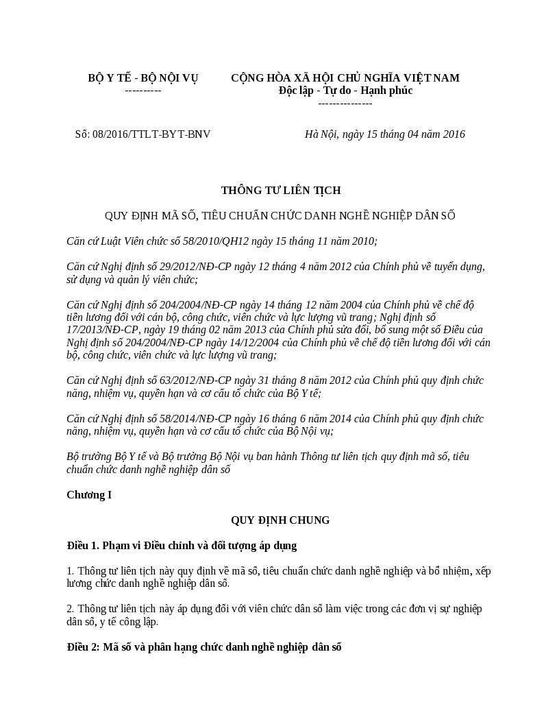 | Tiêu đề văn bản | 08_2016_TTLT-BYT-BNV THÔNG TƯ LIÊN TỊCH Quy địnhj mã số chức danh viên chức Dân số | ||
