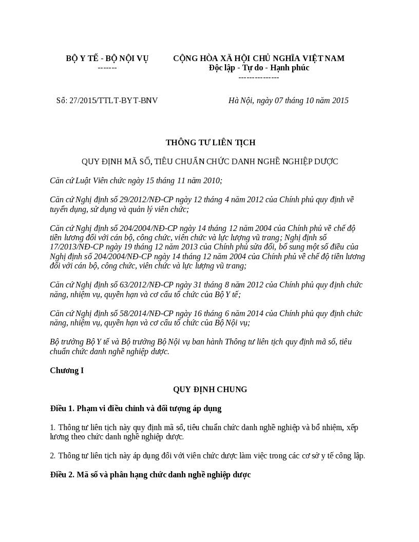 | Tiêu đề văn bản | 27_2015_TTLT-BYT-BNV_THÔNG TƯ LIÊN TỊCH QUY ĐỊNH MÃ SỐ NGHỀ NGHIỆP DƯỢC | ||